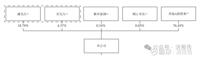 钟先生与肖先生(现有一致行动人士集团)持股约23.16%,且钟先生通过员工持股平台极米咨询及开心米花分别控制0.34%及0.05%,合计控制23.55%权益;其他A股股东合计持股约76.45%。