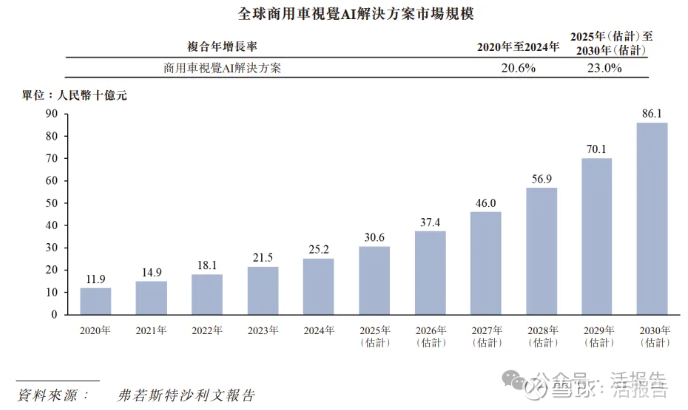 据弗若斯特沙利文(Frost & Sullivan)的资料,2024年商用车视觉AI解决方案市场规模达到人民币252亿元,2020年至2024年的复合年增长率为20.6%。该市场预计将持续扩张,2025年至2030年的估计复合年增长率为23.0%。