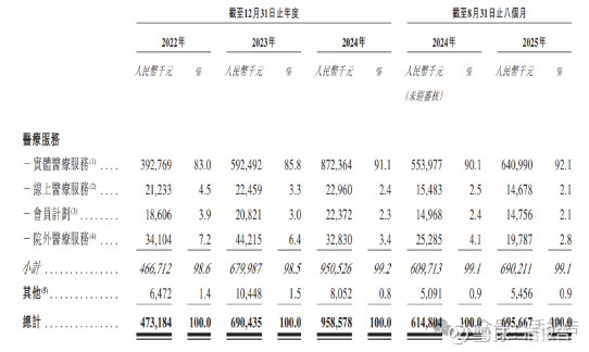 公司的收入主要来源于医疗服务,包括实体医疗服务、线上医疗服务、会员计划和院外医疗服务。2025年前八个月,实体医疗服务营收贡献达92.1%。