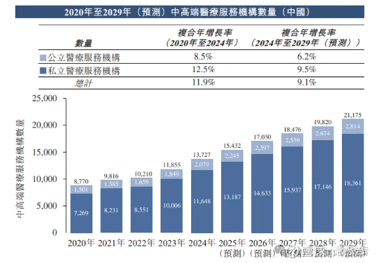 根据弗若斯特沙利文(Frost & Sullivan)的资料,2020年至2024年,私立中高端医疗服务机构数量快速增长,从2020年的7,269家增加至2024年的11,648家,复合年增长率为12.5%,预计从2024年至2029年将进一步以9.5%的复合年增长率增长,到2029年将达到18,361家。