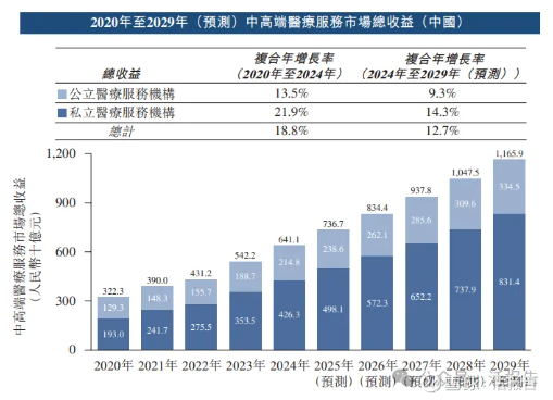 根据弗若斯特沙利文(Frost & Sullivan)的资料,随着私立中高端医疗服务机构数量的增长,私立中高端医疗服务机构的总收益从2020年的人民币1,930亿元增长至2024年的人民币4,263亿元,复合年增长率为21.9%,预计从2024年到2029年将进一步以14.3%的复合年增长率增长,到2029年将达到人民币8,314亿元。