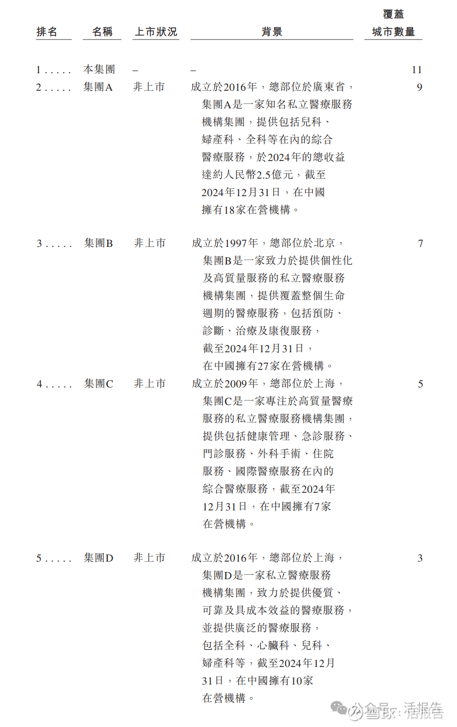 根据弗若斯特沙利文的资料,中国的私立中高端综合医疗服务市场高度分散,而按截至2024年12月31日所覆盖的中国城市数量及2024年的付费患者就诊人次计,公司在所有私立中高端综合医疗服务机构集团中分别排名第一及第二。
