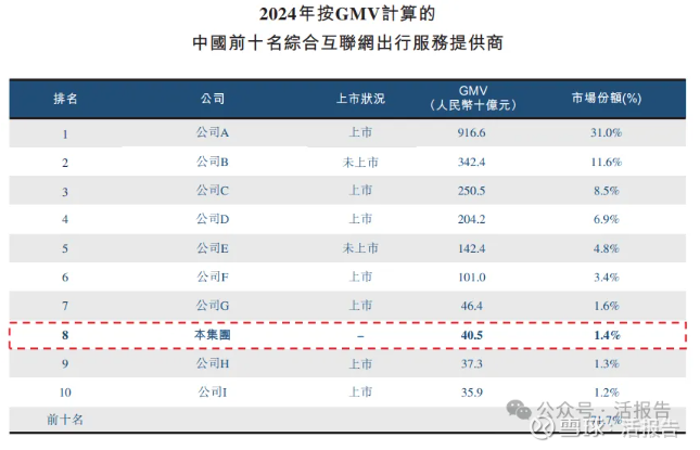 按2024年综合互联网出行服务GMV计,中国前十大提供商约占总市场规模的71.7%,而公司排名第八,GMV为人民币405亿元及市场份额约为1.4%。