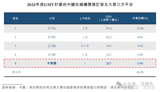 于2024年,按GMV计算,中国前五大第三方平台占在线机票预订市场份额约46.2%,其中公司排名第五,GMV为人民币257亿元及市场份额约为1.9%。