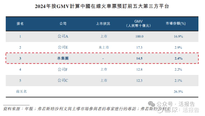 于2024年,按GMV计算,中国前五大第三方平台占在线火车票预订市场份额约26.5%,其中公司排名第三,GMV为人民币145亿元及市场份额约为2.4%。