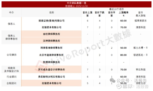据LiveReport大数据统计,活力集团中介团队共计10家,其中保荐人2家,近10家保荐项目数据表现尚可;公司律师共计3家,综合项目数据表现不一。整体而言中介团队历史数据表现一般。