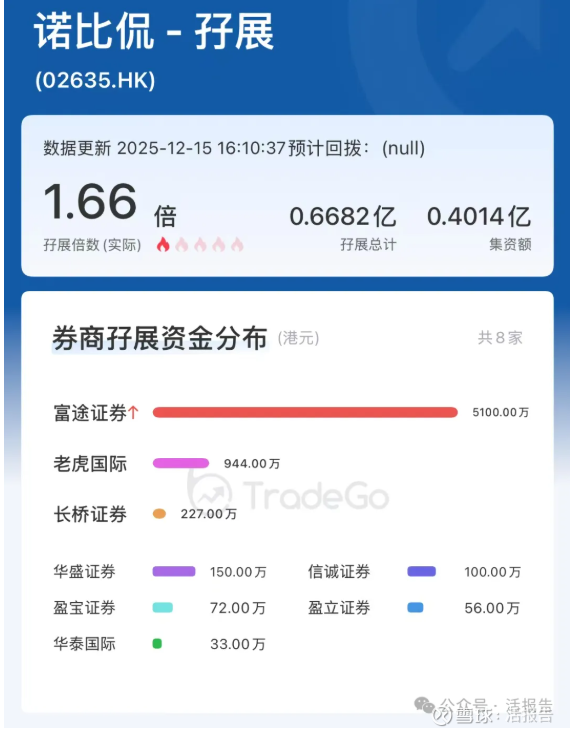 据TradeGo新股孖展数据,截至12月15日16时,诺比侃孖展总额已达6682万港元,孖展认购倍数约1.66倍,首日认购已足额。其中,富途证券、老虎证券、长桥证券分别放出5100万、944万、227万港元。