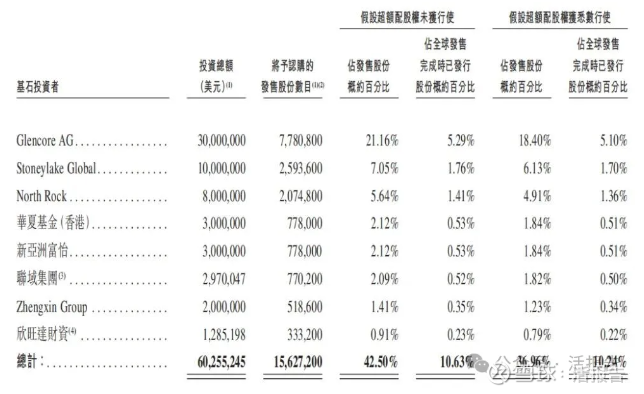 本次发行以机制B分配,公开发售占10%,无强制回拨。国配引入8家基石投资者(Glencore AG、Stoneylake Global、North Rock、华夏基金(香港)、新亚洲富怡、联域集团、Zhengxin Group、欣旺达财资),认购约6千万美元,占全球发售股份的42.50%。