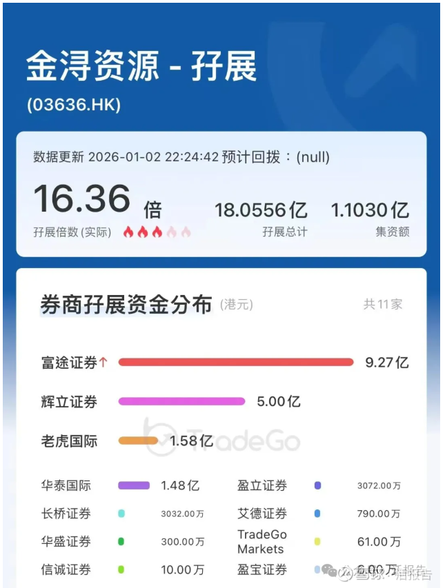 据TradeGo新股孖展数据,截至2026年1月2日22时,金浔股份孖展总额已达18.06亿港元,孖展认购倍数约16.36倍,认购已足额。其中,富途证券、辉立证券、TradeGo Markets分别放出9.27亿、5.00亿、61.00万港元。