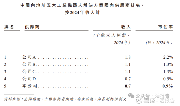 根据弗若斯特沙利文的资料,于2024年,按轻负载工业机器人出货量及轻工业领域工业机器人出货量计,公司在中国内地工业机器人解决方案市场均排名第一。