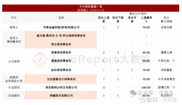 据LiveReport大数据统计,拓斯达中介团队共计9家,其中保荐人1家,近10家保荐项目数据表现普通;公司律师共计3家,综合项目数据表现有待加强。整体而言中介团队历史数据表现中规中矩。