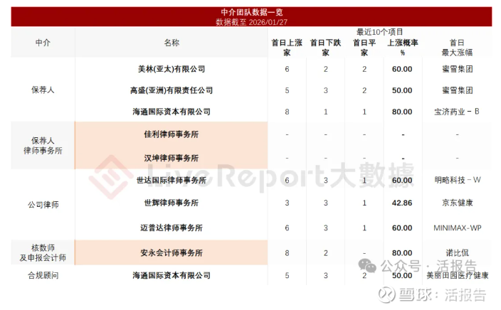 据LiveReport大数据统计,京东产发中介团队共计10家,其中保荐人3家,近10家保荐项目数据表现普通;公司律师共计3家,综合项目数据表现有待提升。整体而言中介团队历史数据表现平平。