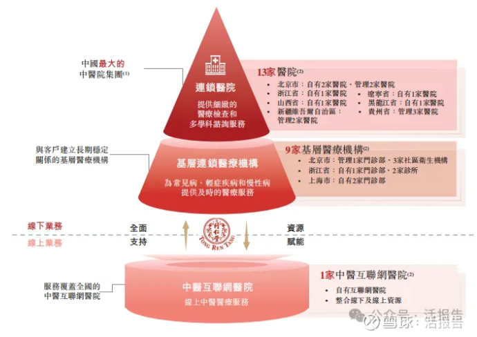 截至最后实际可行日期,公司已建立分级中医医疗服务网络,包括12家自有线下医疗机构及一家互联网医院,以及12家线下管理医疗机构。公司依托知名品牌「同仁堂」及优质的药品,已积累及整合大量线上线下医疗资源。