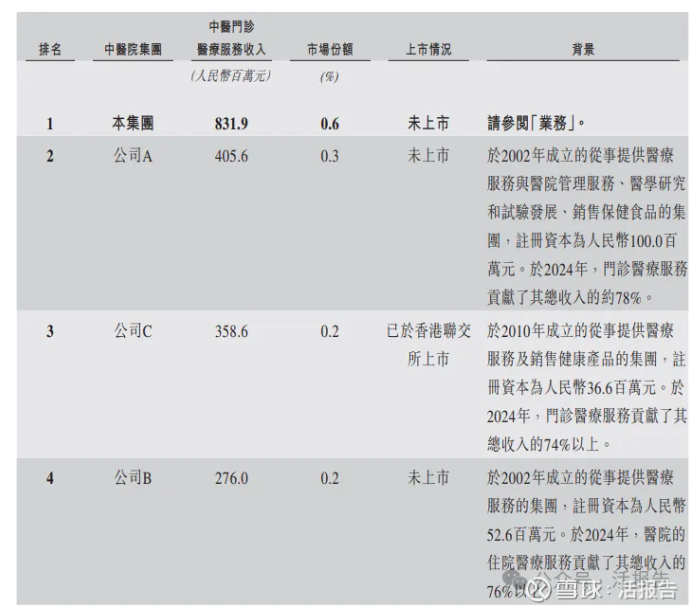 按2024年总门诊人次及住院人次计,公司在中国非公立中医院医疗服务行业的所有中医医院集团中排名第一。按2024年中医医疗服务总收入计,公司在中国非公立中医院医疗服务行业的所有中医医院集团中排名第二。