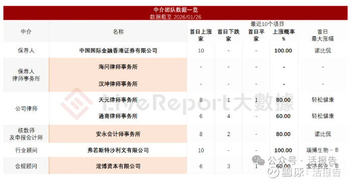 据LiveReport大数据统计,同仁堂医养中介团队共计8家,其中保荐人1家,近10家保荐项目数据表现出色;公司律师共计2家,综合项目数据表现良好。整体而言中介团队历史数据表现尚可。