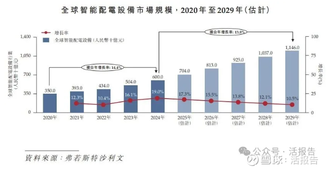 全球智能配电设备行业的市场规模从2020年的约人民币3,500亿元增至2024年的约人民币6,000亿元,期内复合年增长率约为14.4%。预计到2029年全球智能配电设备行业的市场规模将达到约人民币11,460亿元,2024年至2029年的复合年增长率约为13.8%。