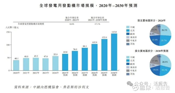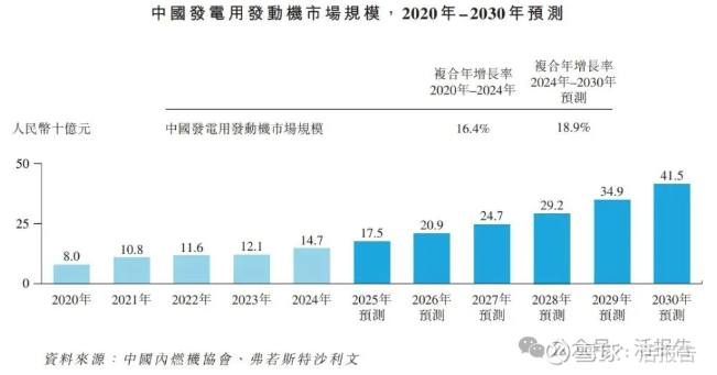 根据弗若斯特沙利文(Frost&Sullivan)的报告,就收入而言,全球发电用发动机市场由2020年的人民币401.0亿元增长至2024年的人民币559.0亿元,复合年增长率为8.6%。预期到2030年将达到人民币1,438.0亿元,2024年至2030年的复合年增长率为17.1%。