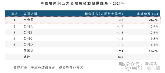 公司是领先的发电动力解决方案供货商。根据弗若斯特沙利文的资料,按2024年中国发电用发动机的销售收入计,公司是中国最大的发电用发动机供货商,亦是中国领先的船用发动机供货商,按2024年中国中高速船用发动机销售收入计排名第二。