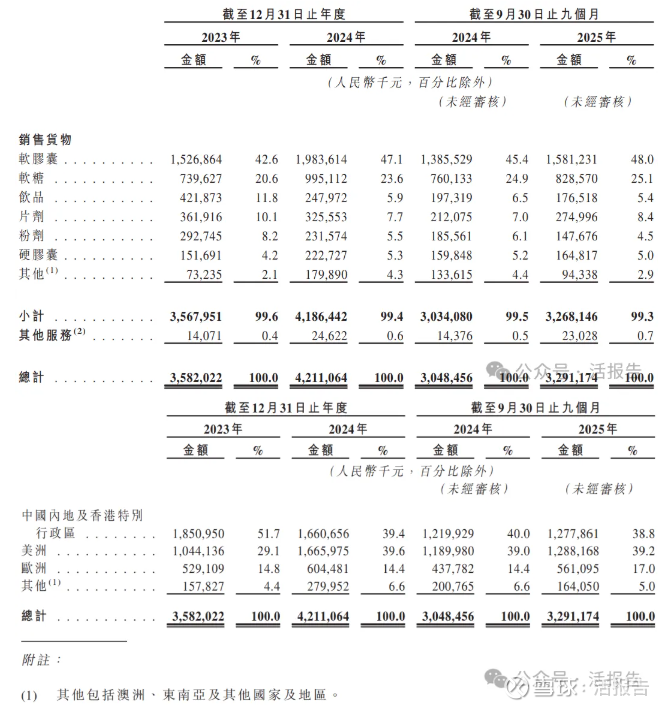 公司收入主要来源于营养健康食品的产品销售,其中软胶囊和软糖是贡献最大的剂型。2024年,软胶囊和软糖合计占收入比例较高,而饮品、片剂、粉剂及硬胶囊等其他剂型所占收入比例相对较小。此外,公司海外市场收入占比较高,截至2025年9月30日止九个月,海外市场收入占总收入比例达61.2%,凸显其业务的国际化布局。
