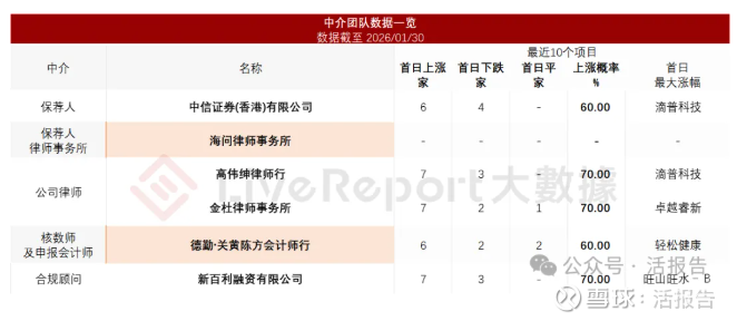 据LiveReport大数据统计,仙乐健康中介团队共计6家,其中保荐人1家,近10家保荐项目数据表现有待提升;公司律师共计2家,综合项目数据表现普通。整体而言中介团队历史数据表现缺乏亮点。