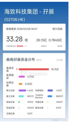 据TradeGo新股孖展数据,截至2月6日9时,海致科技集团的孖展认购总额已达26.13亿港元,孖展认购倍数约33.28倍。其中,富途证券、老虎国际、长桥证券分别放出16.15亿、3.31亿、2.00亿港元的孖展。