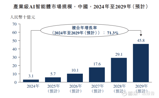 此外,据弗若斯特沙利文报告显示,中国产业级AI智能体市场规模将在2024年到2029年间实现爆发式增长,从2024年 的约人民币31亿元跃升至2029年的人民币458亿元,期间复合年增长率高达71.3%。