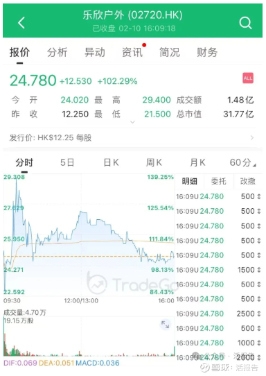 乐欣户外上市首日大幅高开96%,早盘最高涨幅一度达到140%,最终收盘仍大涨102.29%。截至首日收盘,总市值约31.77亿港元,全天成交额约1.48亿港元。