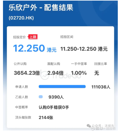 配售结果显示,乐欣户外本次申购人数共11.1万人,公开认购达3654.23倍,国配认购2.94倍,一手中签率仅有1%。