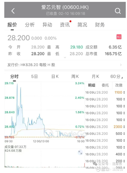 上市首日,爱芯元智股价平开,最高涨约3.5%而后回落,但在稳价人中金公司使用绿鞋资金护盘的情况下,股价稳住发行价之上,最终平价收盘。截至首日收盘,总市值约165.75亿港元,全天成交额约6.35亿港元。
