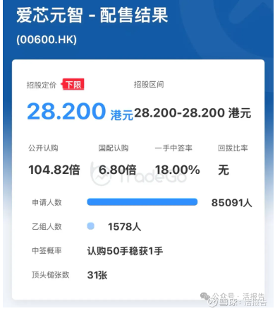配售结果显示,爱芯元智本次申购人数共8.5万人,公开认购104.82倍,国配认购6.8倍,一手中签率18%。