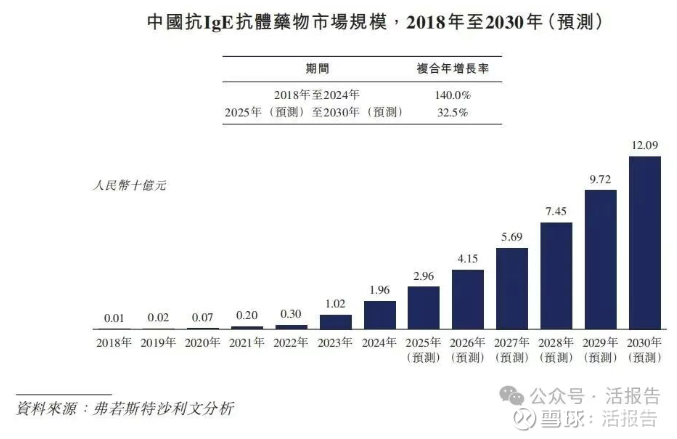 根据弗若斯特沙利文(Frost & Sullivan)的报告,中国抗IgE抗体药物的市场规模从2018年的人民币10.0百万元增加至2024年的人民币20亿元,预计到2030年将继续增长至人民币121亿元,期间复合年增长率为32.5%。