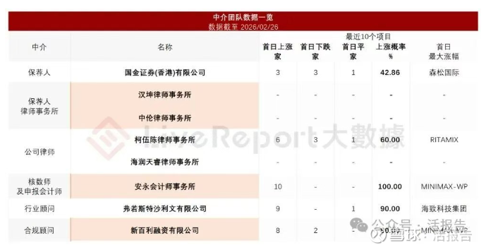 据LiveReport大数据统计,天辰生物中介团队共计8家,其中保荐人1家,近10家保荐项目数据表现不理想;公司律师共计2家,综合项目数据表现普通。整体而言中介团队历史数据表现中规中矩。