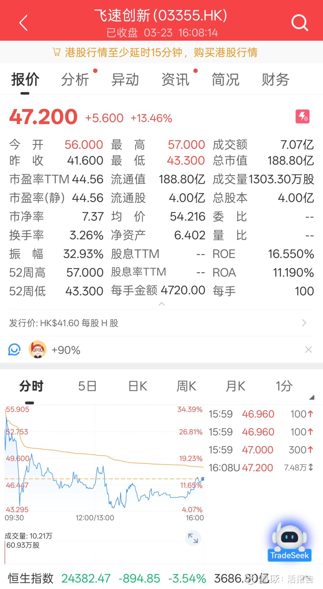 上市首日,公司股价高开34.62%,随后高开低走,最终收涨13.46%。首日收盘总市值达188.8亿港元,全天成交额约7.07亿港元。若按收盘价计,每手中签赚约560港元。