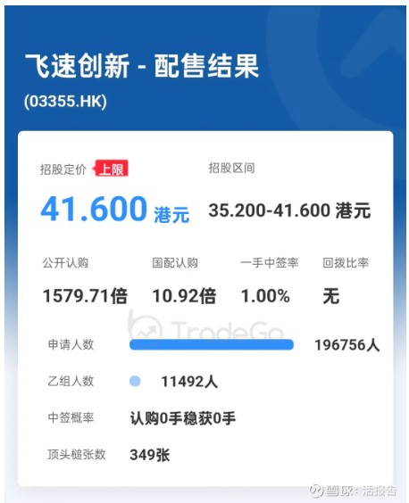 配售结果显示,飞速创新本次申购人数共196756人,公开认购1579.71倍,国配认购10.92倍,无回拨,一手中签率1.00%。