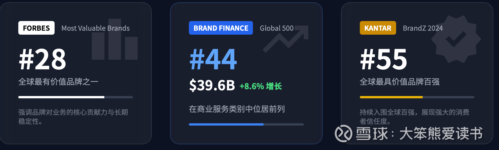 Brand Finance Global 500:第44位,品牌价值约396亿美元(+8.6%增长),在商业服务类别中位居前列。