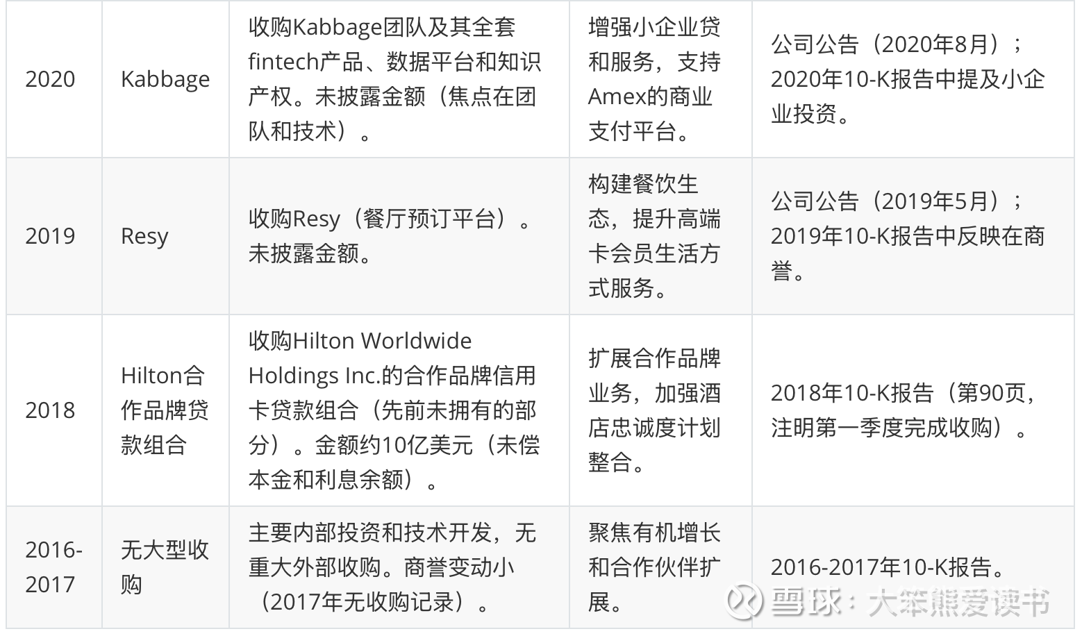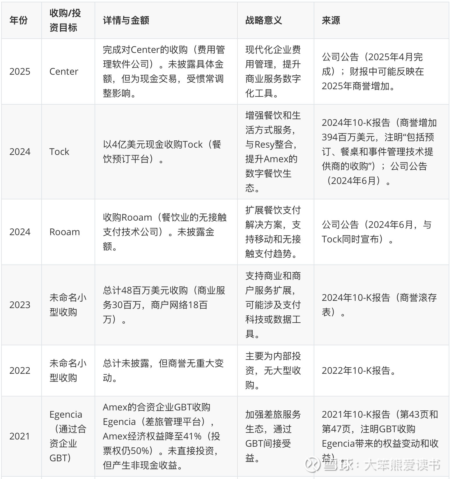 美国运通的投资重点从2018年起转向数字化和生活方式服务(如餐饮、差旅和小企业贷),以应对竞争并提升卡会员粘性。2024-2025年的收购(如Tock、Rooam、Center)反映了后疫情时代对无接触和数字工具的需求。