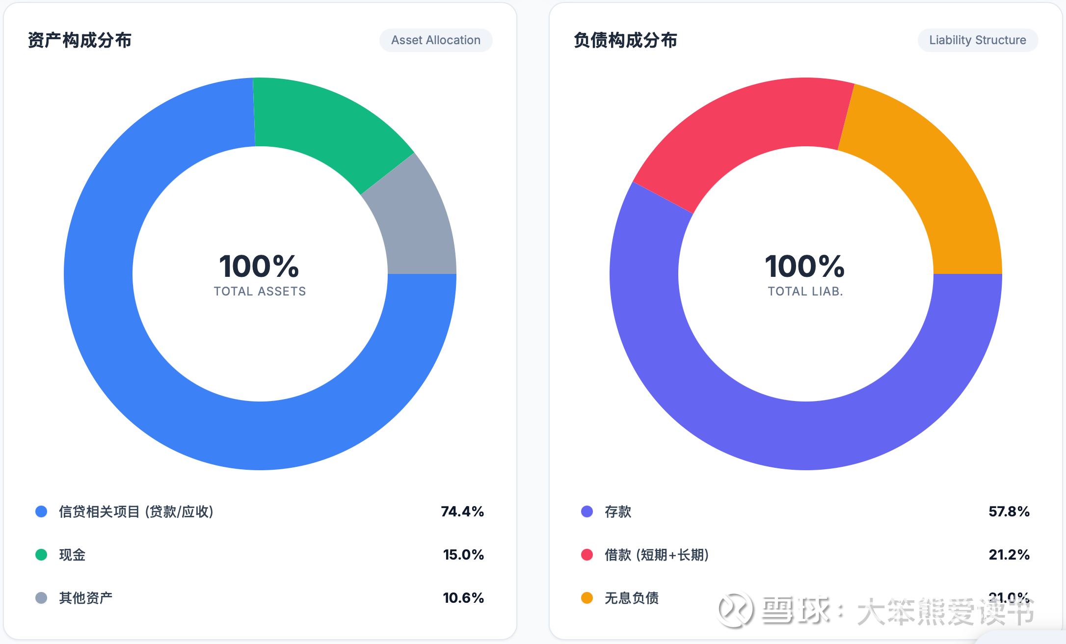负债侧:存款主导(57.8%),借款(短期借款+长期债务)占21.2%,无息负债占21.0%。这表明公司依赖低成本存款融资,类似于银行模式。