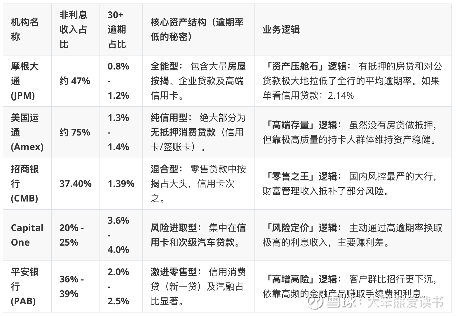 高端客群也让美国运通的逾期率很低(由于美国运通是纯信贷,违约率甚至和混合了按揭贷款的银行差不多)。