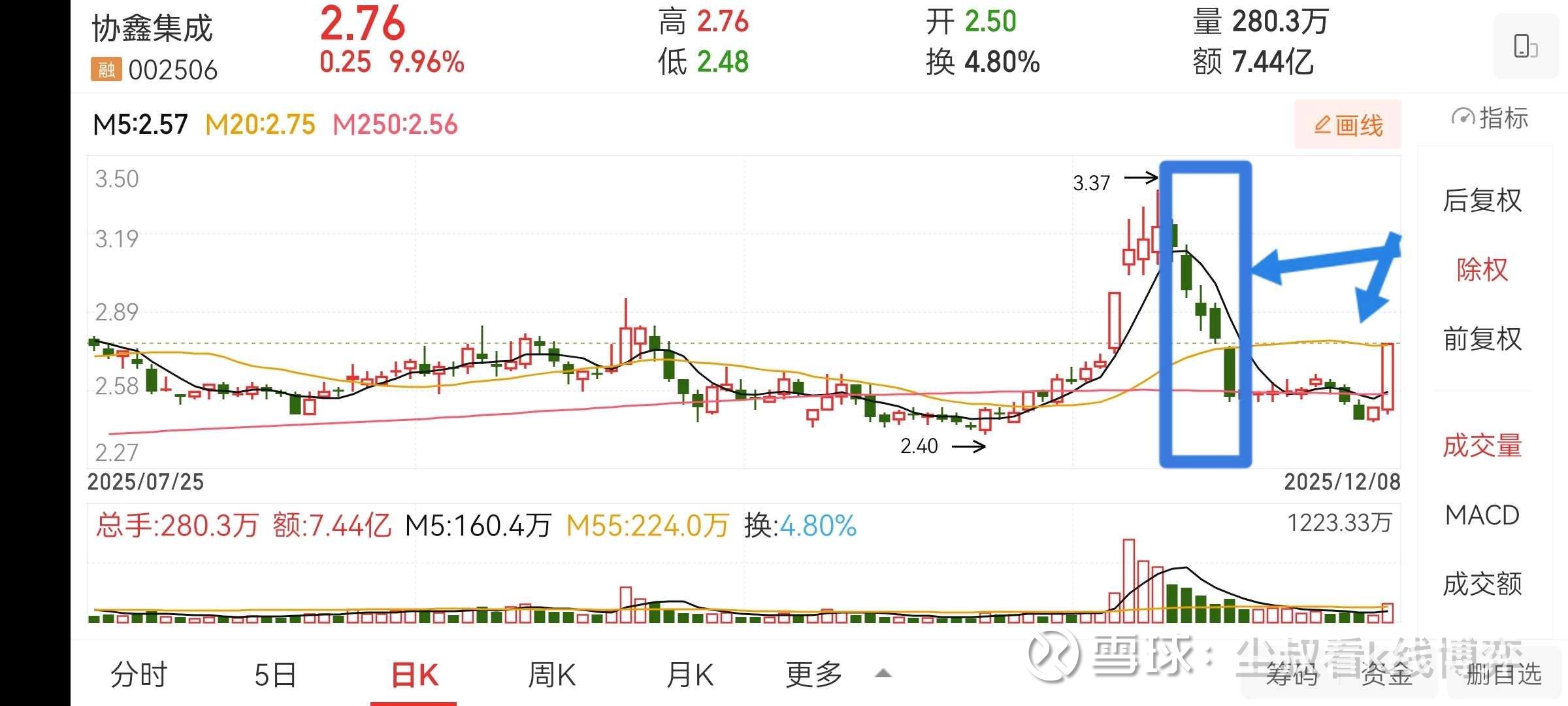 【案例讨论】今天回顾一下1130日分析过的协鑫集成002605。在发表了分析后,我也关注他之后走势,1201日是向上反弹高点但2.64元,但之后三天连续下跌,1204日最低到2.46元,关键是那天走势跌破了250均线。我也疑惑,这股真的不行?1205日收缩量小阳线,收盘价是2.51元,重新回到2.50之上。这天换手率小于上一日,但吃掉了昨天阴线一大半。那说明什么?说明昨天的下跌可能是诱空动作。所以今天就值得重点关注。今天开盘就是一波强势攻击,一把拉到2.73元后小幅调整回到2.65元后就再拉一波涨停。今天成交量并不大,说明主力比较轻松。明天能不能延续看主力意图了,但上面是成交量比较大的套牢区,没有量难以持续反弹。如果能缩量再回到2.65附近,或许机会更好一点。从5日线和20日线位置看,相距交叉还有几天,所以觉得冲高会回调,而先调整等待5日线跟上,再反弹更加稳一点。