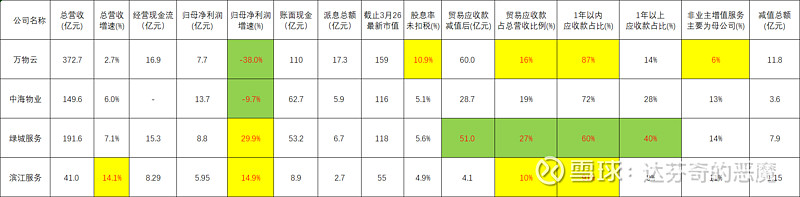 绿色代表异常或是表现较差,黄色代表表现优异。(后续将补充保利物业、碧桂园服务、金茂服务、建发物业)