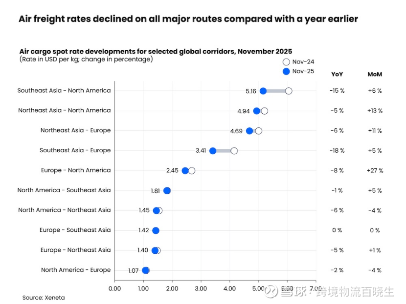 这一背离表明,航空公司正在以牺牲价格纪律为代价追求市场份额,在本就低迷的市场中进一步压缩收益。11月,全球航空货运现货价格环比上涨6%,较去年同期9%的涨幅有所放缓。