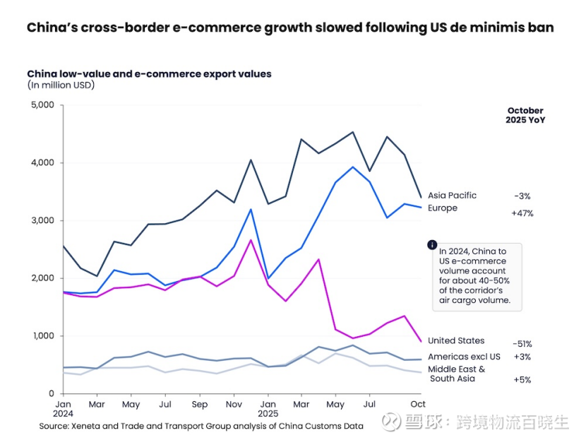 Niall van de Wouw指出进入2026年电商发展所面临的一些警示信号。根据中国海关的最新数据,在连续27个月实现接近40%的同比增长之后,10月份中国的跨境电商总销售额出现了基本持平。尽管中国对欧洲的电子商务贸易依然保持强劲发展势头,10月份的增长率达到了47%,但中国对其他亚洲地区的贸易额出现了下降,降幅为3%;同时,在这种新的市场环境下,中国对美国的电商货物运输量也大幅下降了51%。