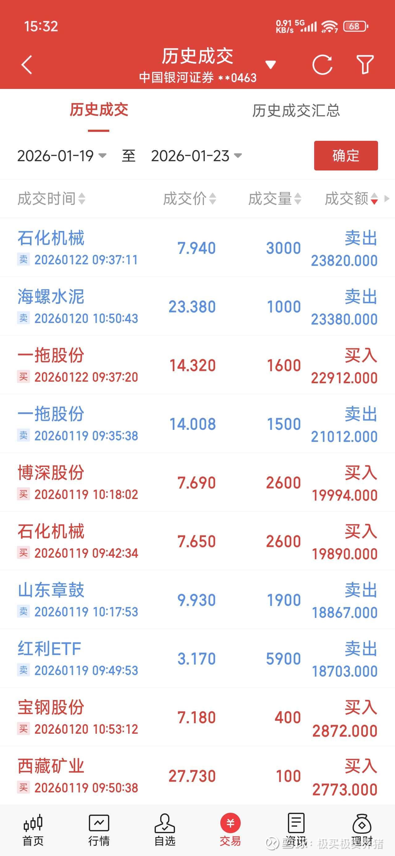 本月前半个月账户表现很不错,第三周有一点点拉胯,超额收益5186米,本周成交记录如图。