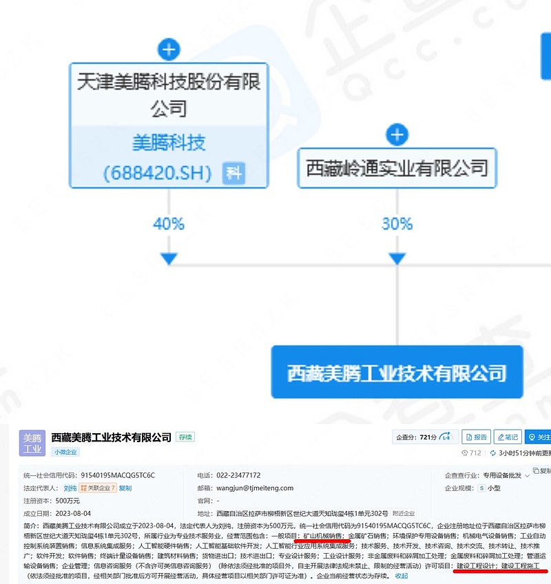 美腾科技:全网西藏基建最小盘!美腾科技市值八亿全网最小盘的西藏基建!子公司西藏美腾工业技术有限公司有基建业务!子公司西藏美腾工业技术有限公司经营范围包含矿山机械销售、建设工程设计、建设工程施工。$美腾科技(SH688420)$ $高争民爆(SZ002827)$ $西藏天路(SH600326)$