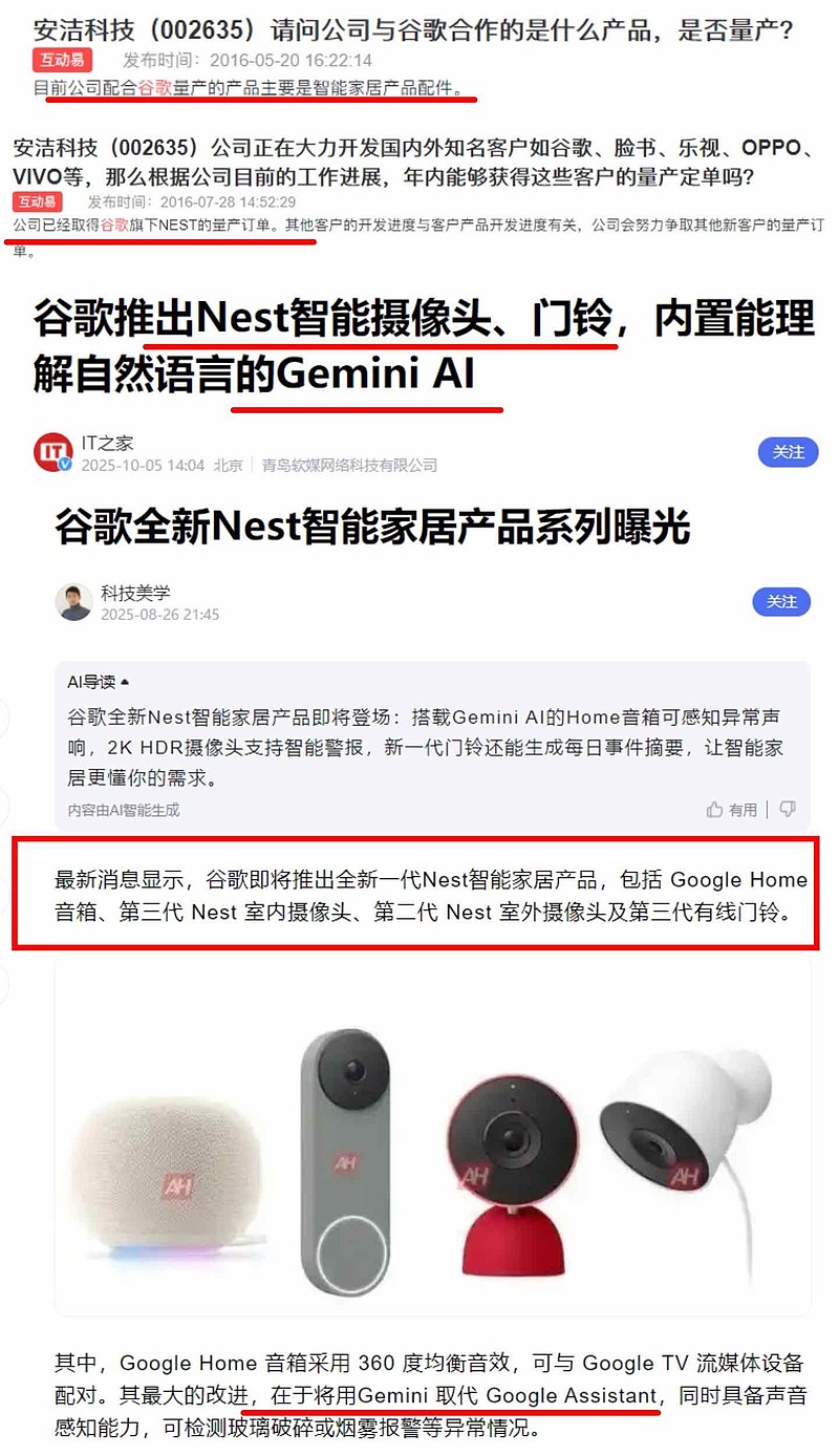 而nest就是谷歌旗下的ai智能家居,已经融合了谷歌gemini ai大模型,正宗的谷歌ai硬件!而安洁科技已经供货nest,且有量产订单!