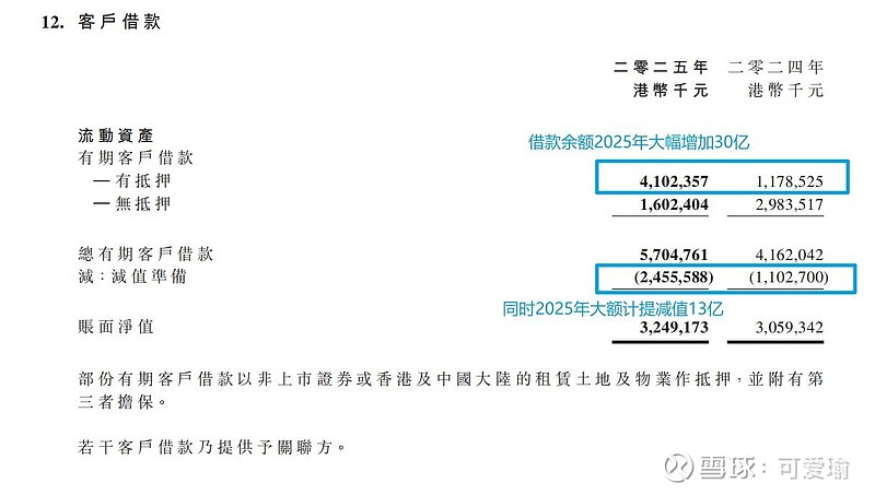 根据光大控股2025年财报披露,‘客户借款’科目余额显著增加且计提了24.6亿港币的减值损失,其中附注提及存在向关联合方提供借款的情况。