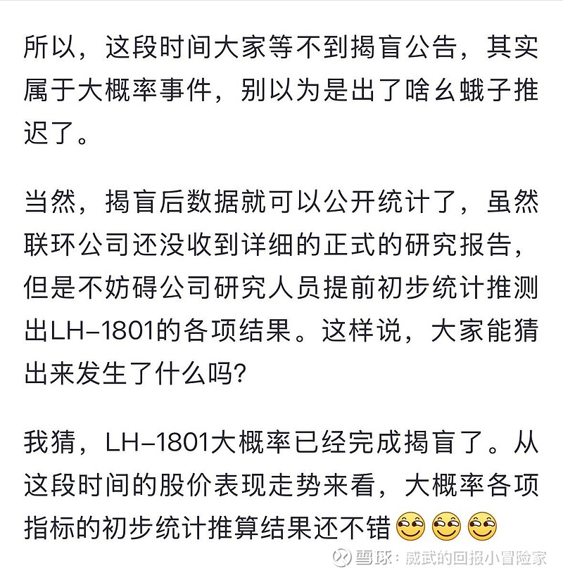 已经完成揭盲的事实证明了不存在重大安全事故;去年7月的股价暴涨证明了24周 HbA1c(主要终点)这一生死线至少是非劣效的。这两点及一期临床结果披露的安全性数据,基本上说明了LH-1801是一款降糖效果良好且安全性极佳的药物。