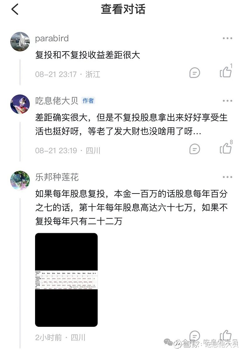 举个简单的例子,我们买入一家公司的股票相当于自己开了一家面馆,股票的分红就是面馆每年赚的利润分配给股东的部分;如果我们不复投,可以理解成每年收回一定的成本;如果采用复投,可以理解成开分店,就有两种结果,经营得好,主店和分店赚得就更多,经营不好,那么有可能成本一点都没收回还亏损;我喜欢的方式就是优先收回成本,之后在面馆稳定分红的前提下,去投资开分店;
