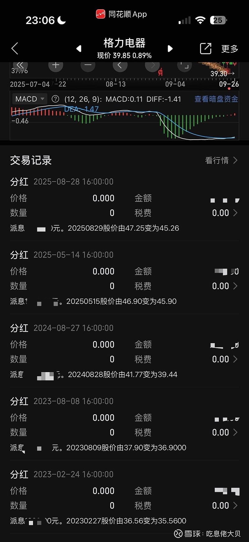1、复利投资并不等于分红马上再投:拿格力电器举例,过去格力股价连续上涨,分红也越来越多,如果每次分红马上再投入的话,成本会越来越高,最后一个大回调,居然亏损(比如我的主账户投资格力七年了成本到了33.5左右),反观我从来没有再投入的账户,成本为负值: