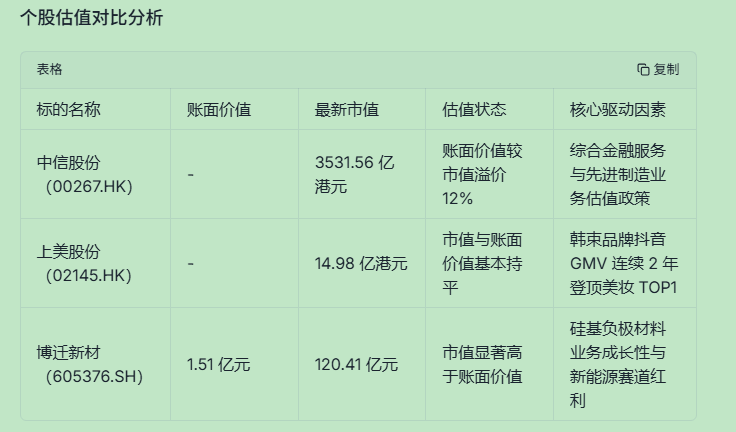 估值差异解析:中信股份市净率 0.42 反映市场对金融板块的谨慎预期1;上美股份 2024 年净利润增长 74%支撑消费赛道估值合理性2;博迁新材市盈率 TTM 78.20 体现市场对其新能源材料业务的高成长预期3。